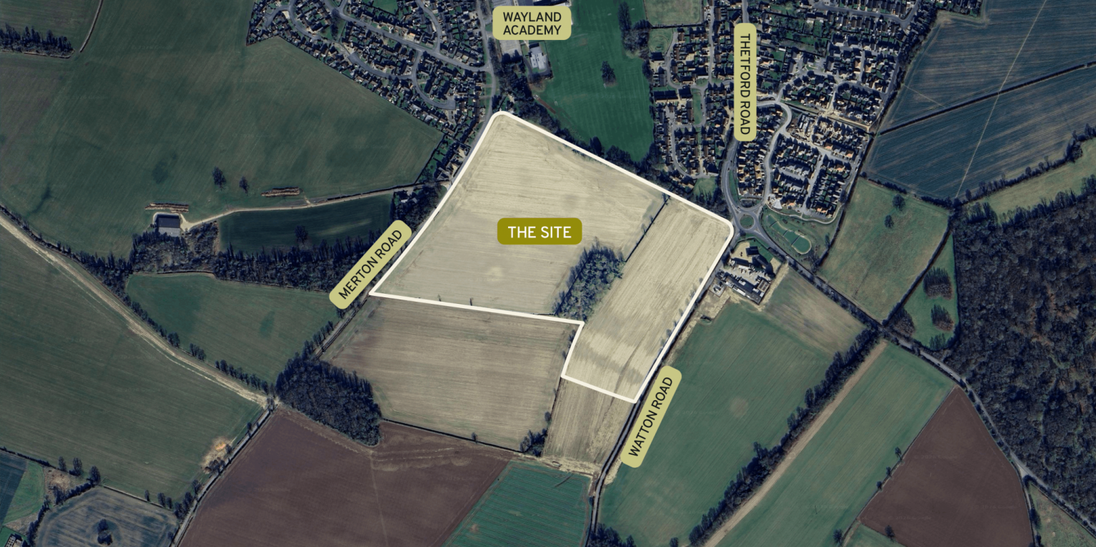 The site is located between Watton Road and Merton Road.